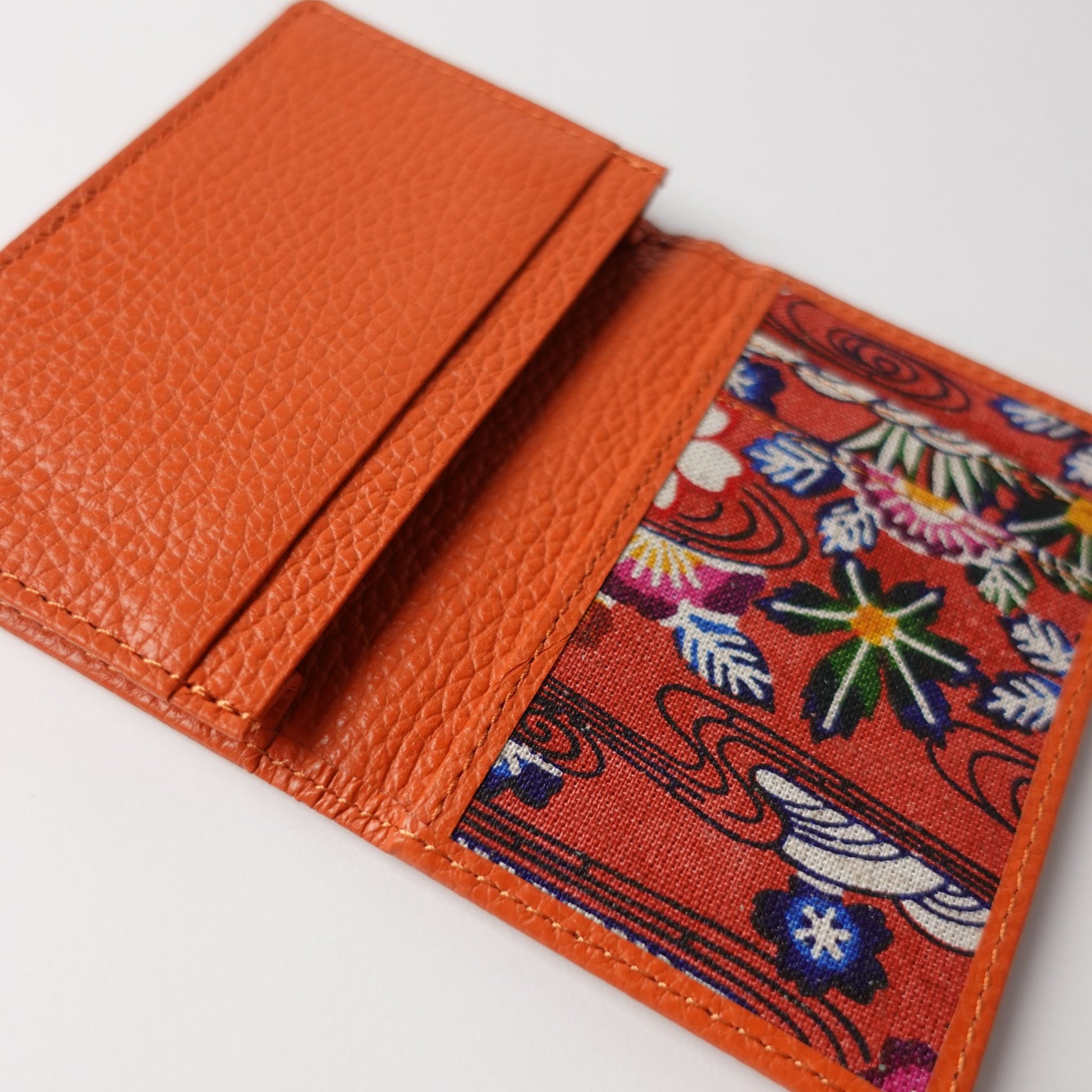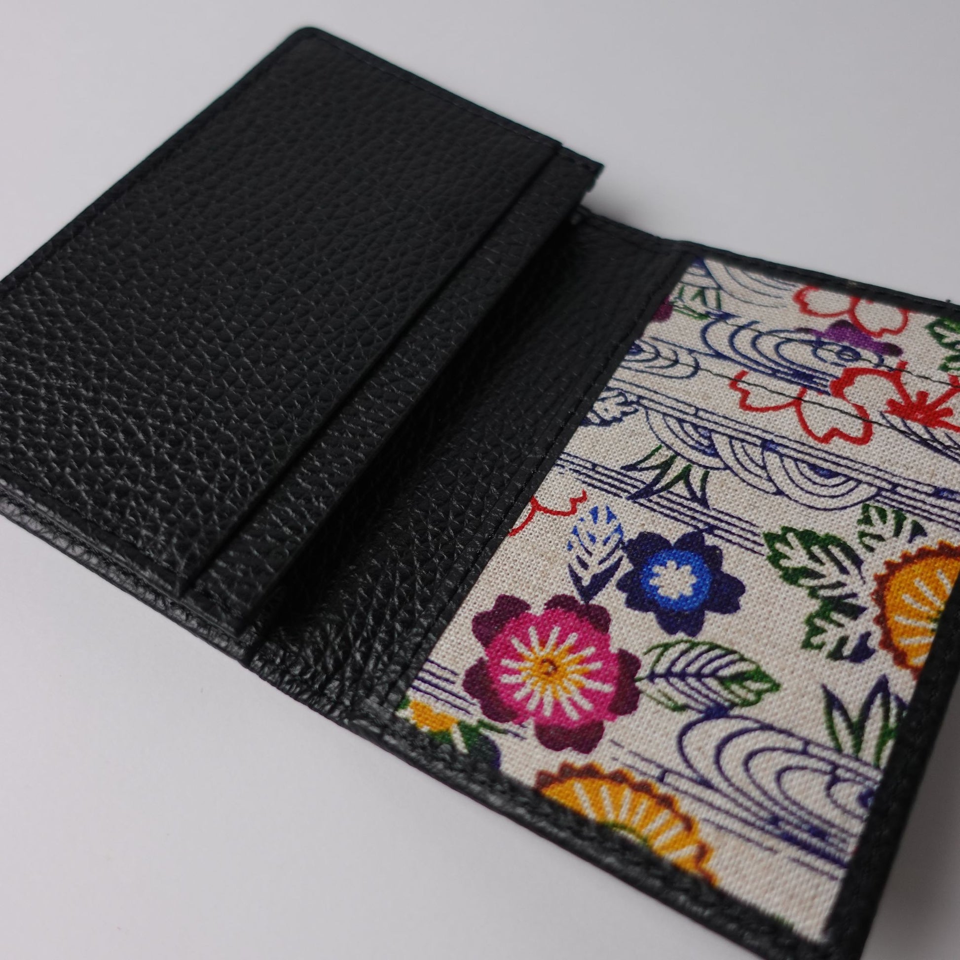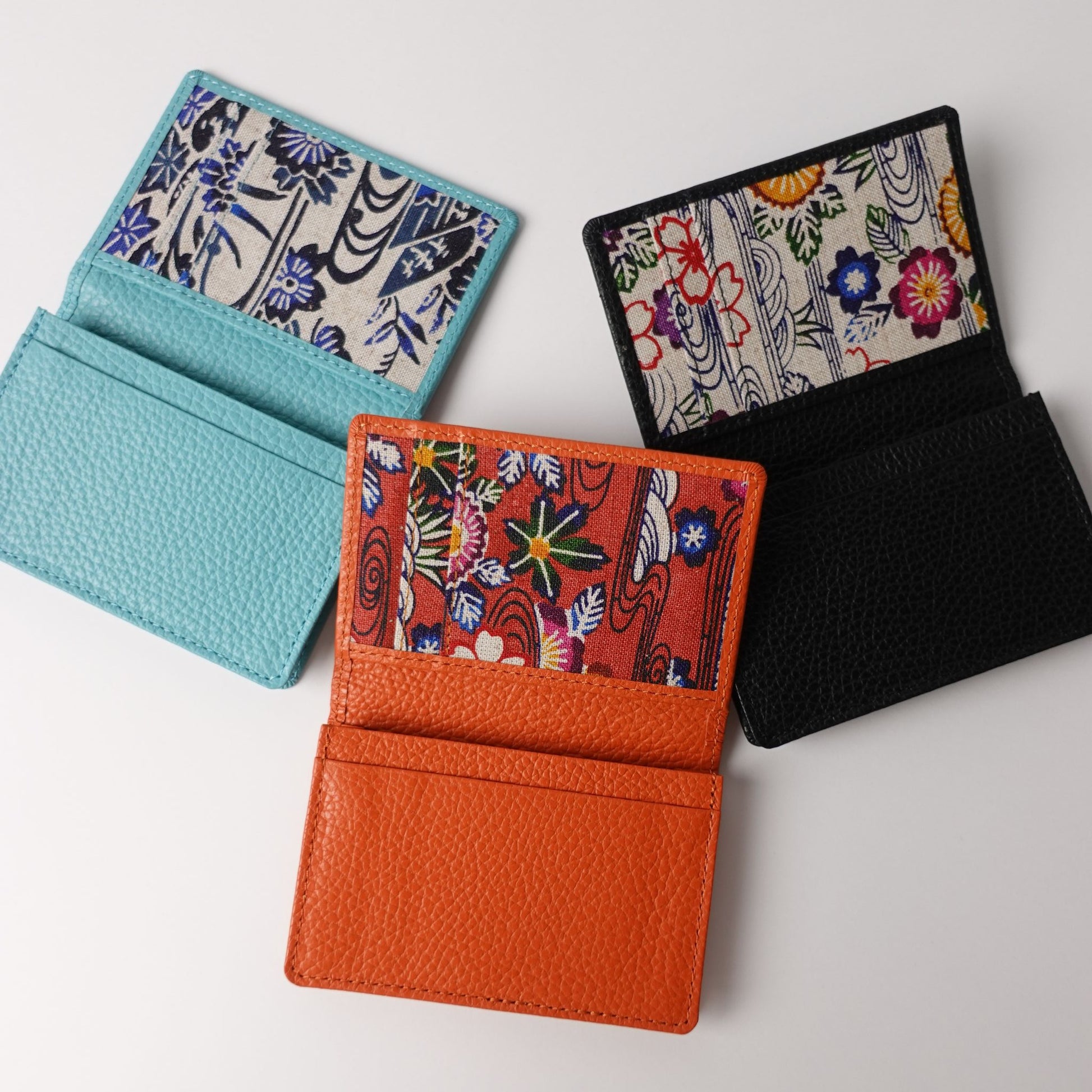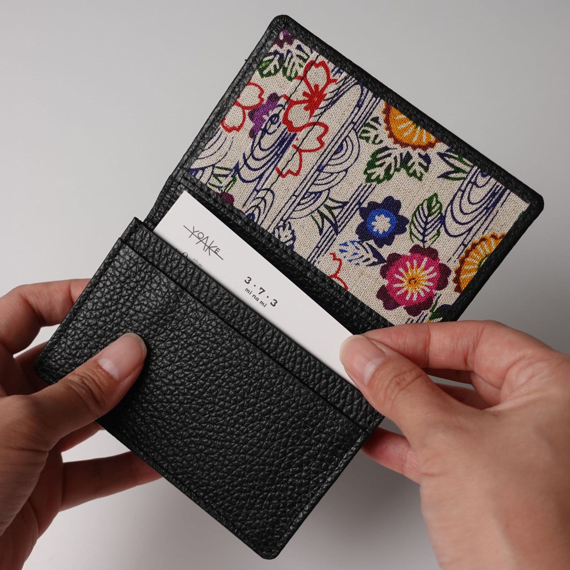 手捺染の技法を生かして表現した紅型柄と本革(栃木レザー)を使用した名刺入れ。