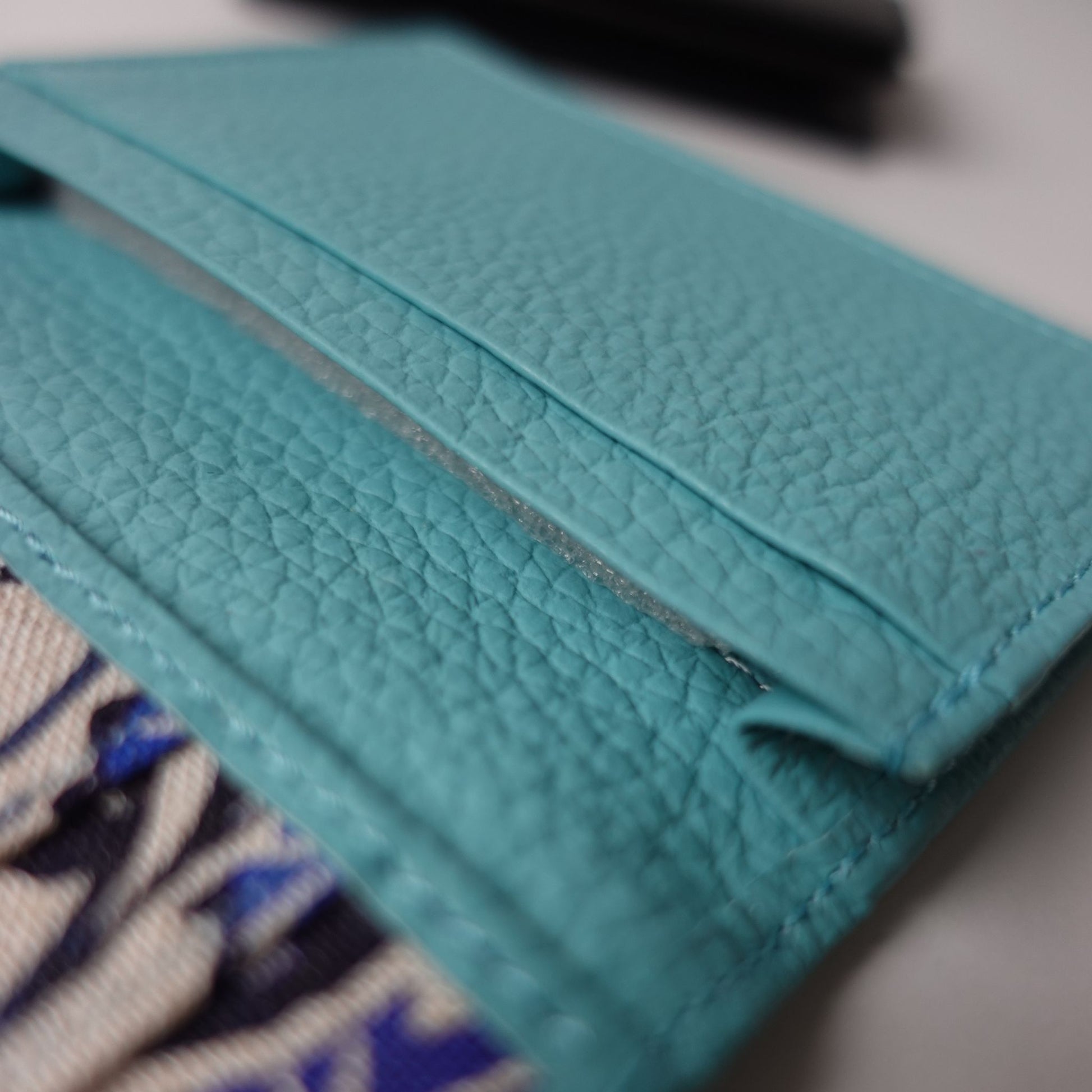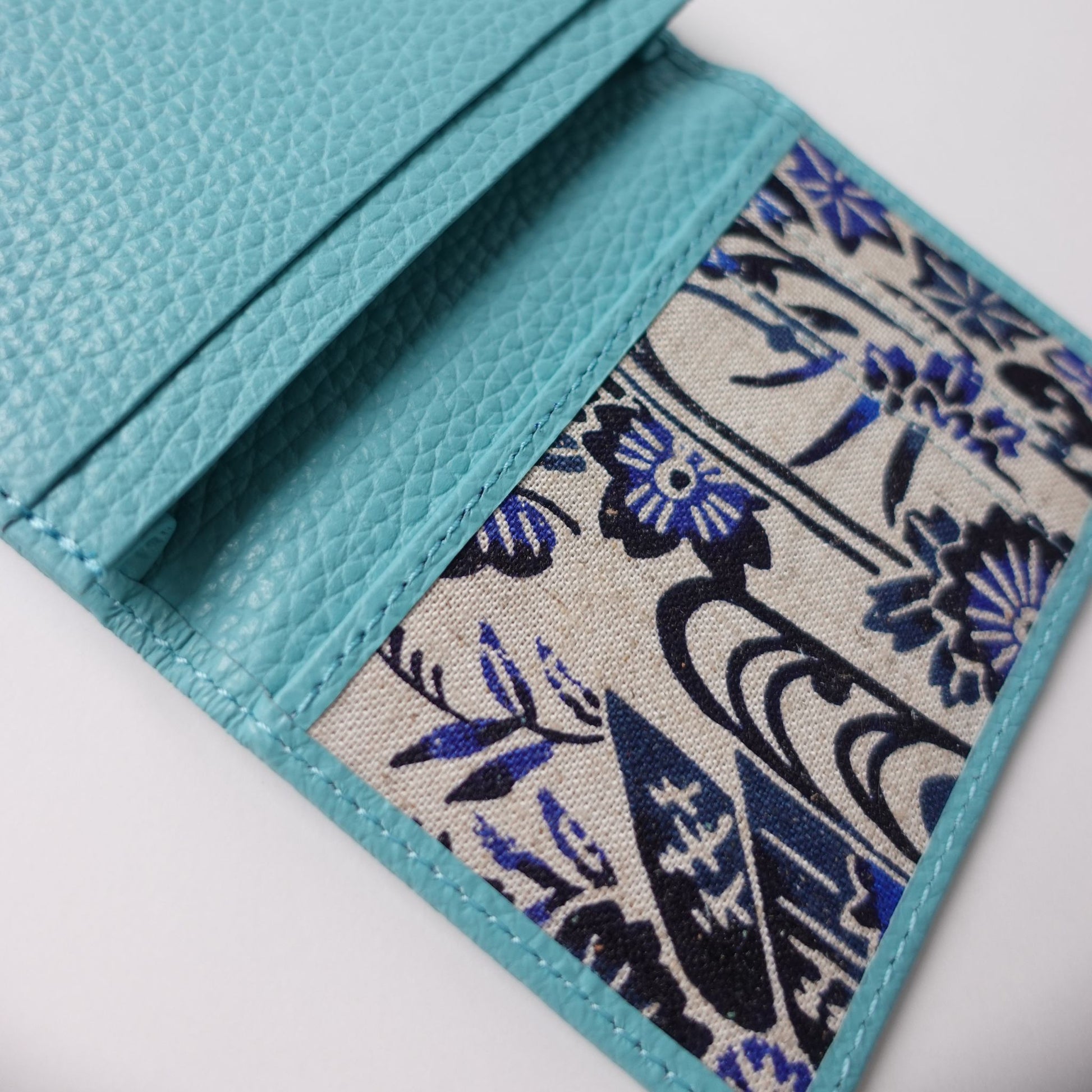 フラップを開けると南風堂の自社工場で手捺染で染めた紅型柄が。本革とのマッチングで上品な雰囲気に仕上がりました。