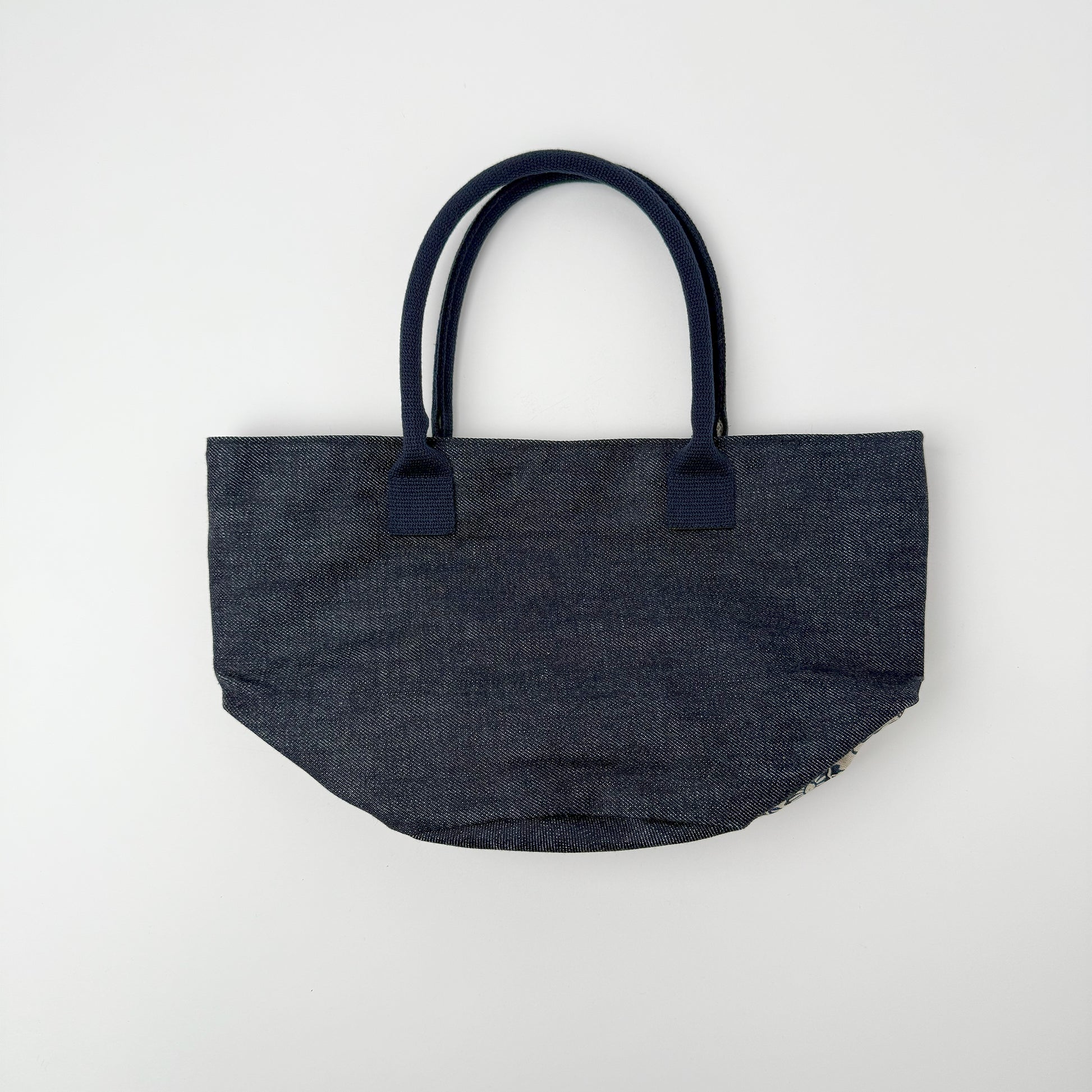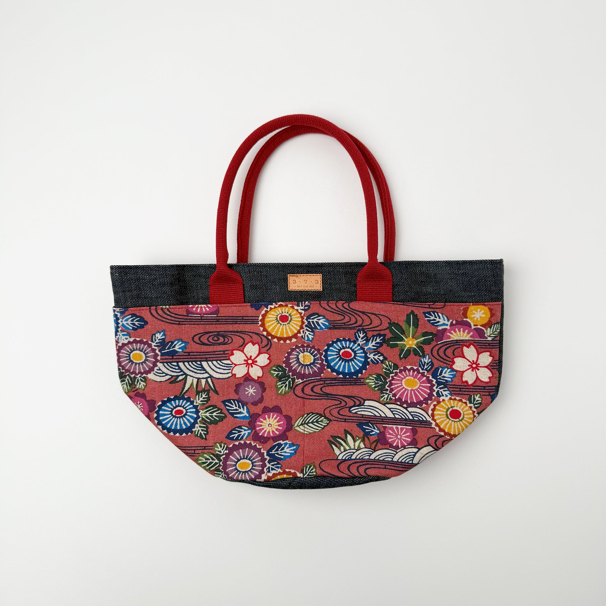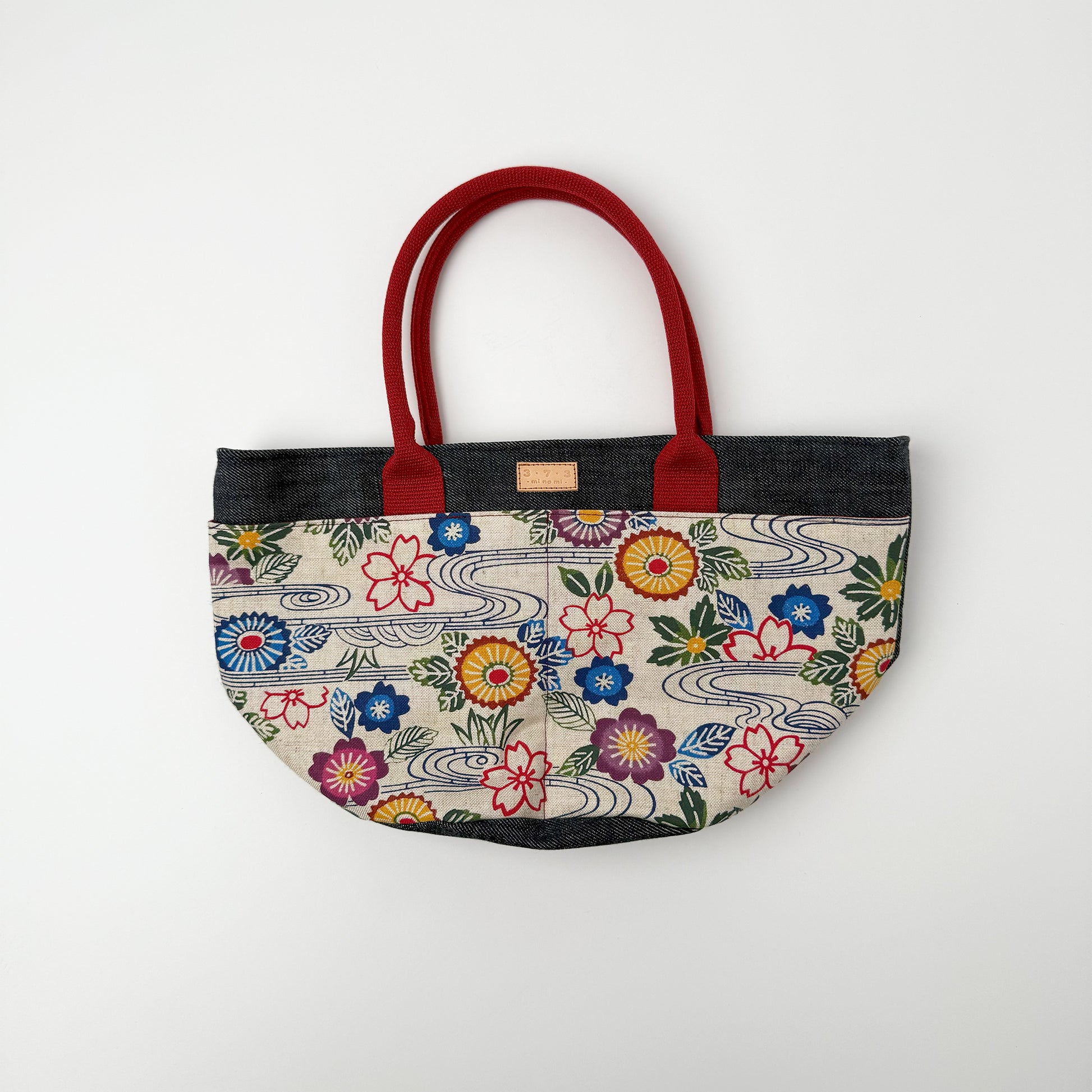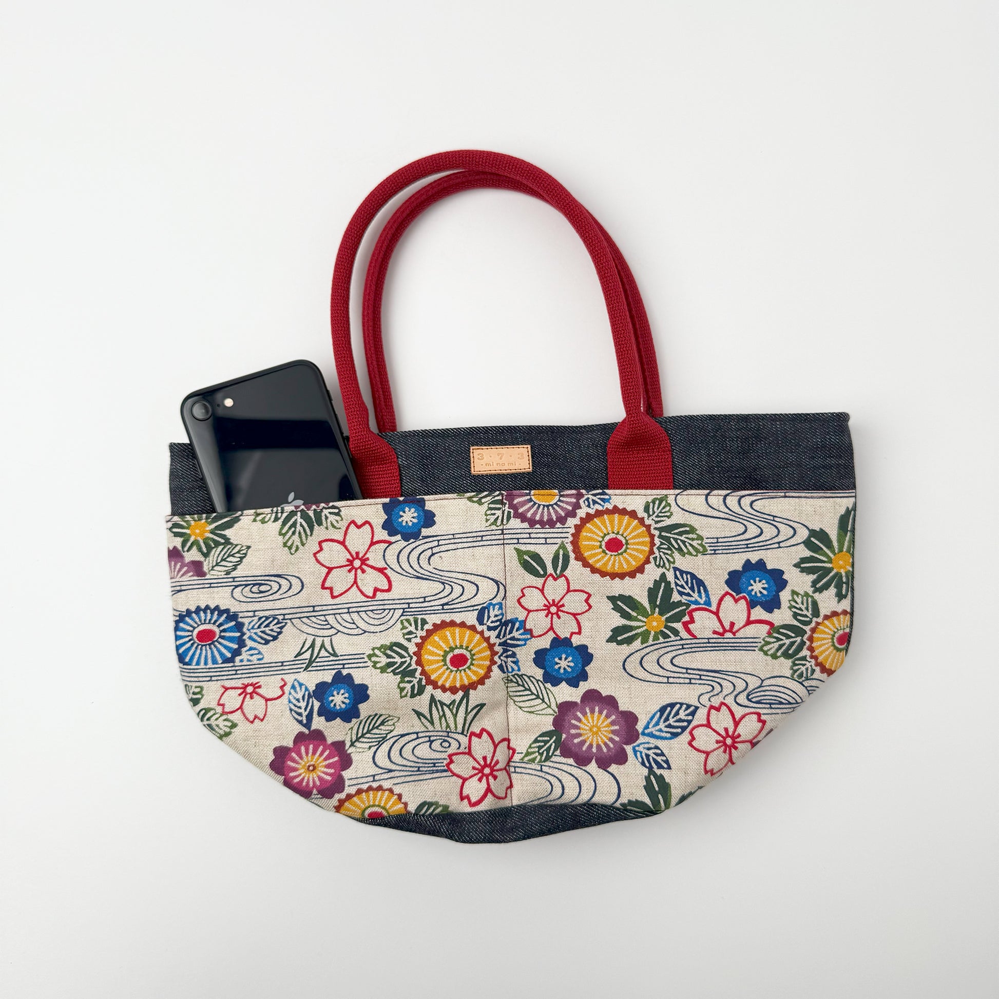 手捺染の技法を生かして表現した紅型柄と高品質な岡山デニムを掛け合わせました。紅型柄とデニムをバランスよく配置し、日常使いしやすいデザイン。マチもたっぷりとあり、お弁当なども安心して入れられるサイズ感です。紅型柄部分は外ポケットになっていて携帯など入れるのに便利です。内ポケットも1か所あり。
