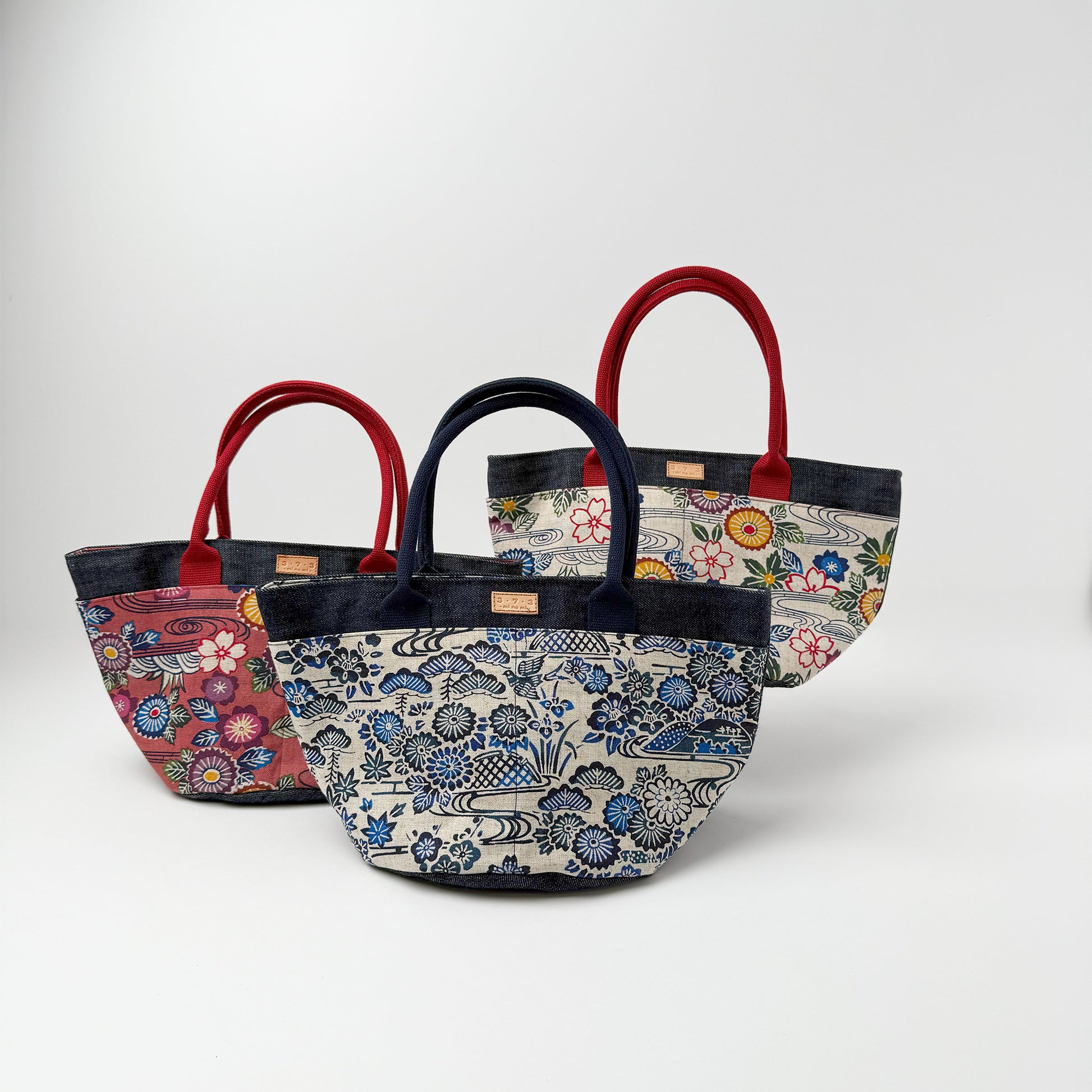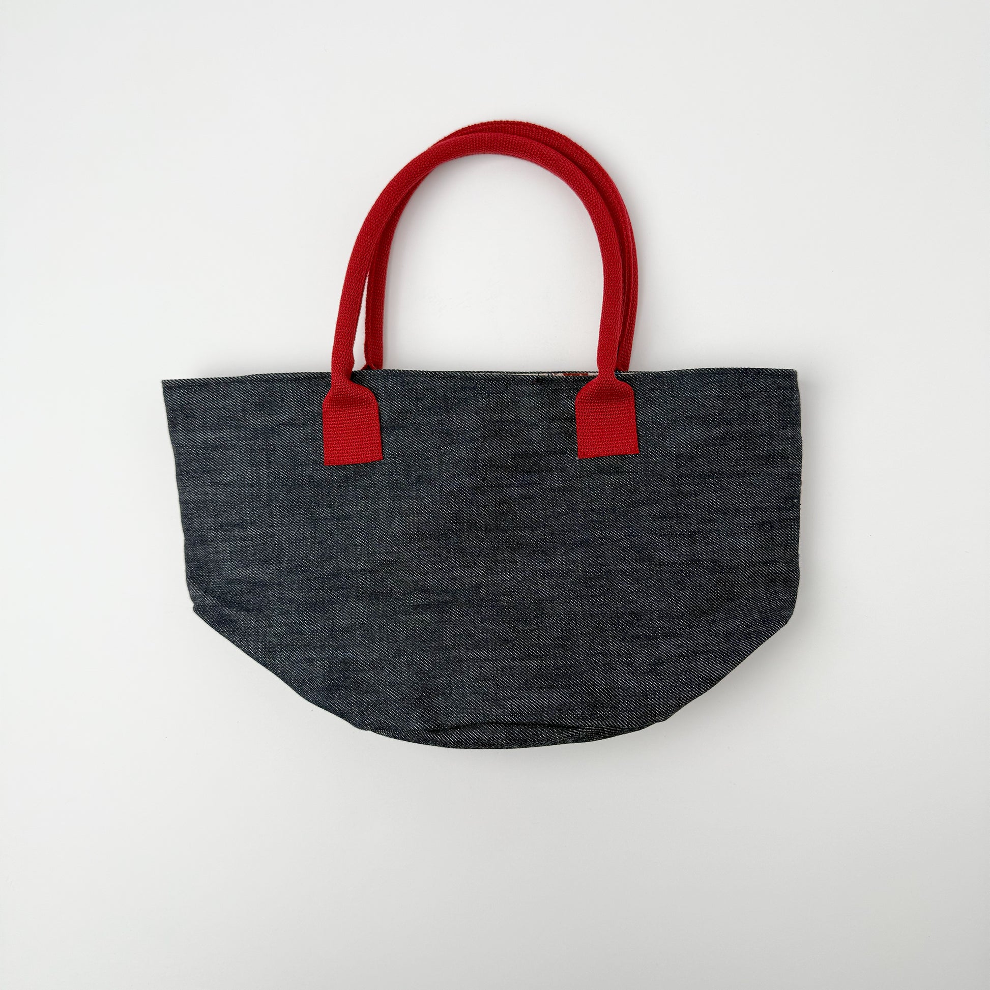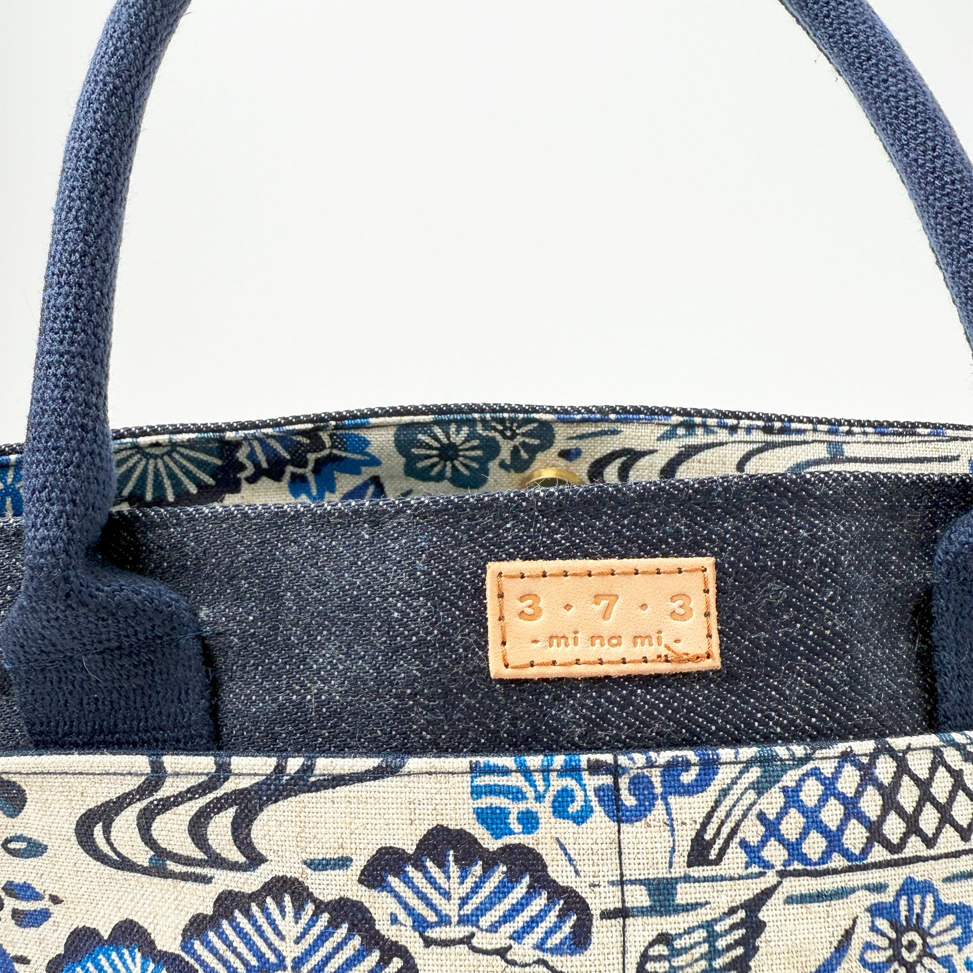 手捺染の技法を生かして表現した紅型柄と高品質な岡山デニムを掛け合わせました。紅型柄とデニムをバランスよく配置し、日常使いしやすいデザイン。マチもたっぷりとあり、お弁当なども安心して入れられるサイズ感です。紅型柄部分は外ポケットになっていて携帯など入れるのに便利です。内ポケットも1か所あり。