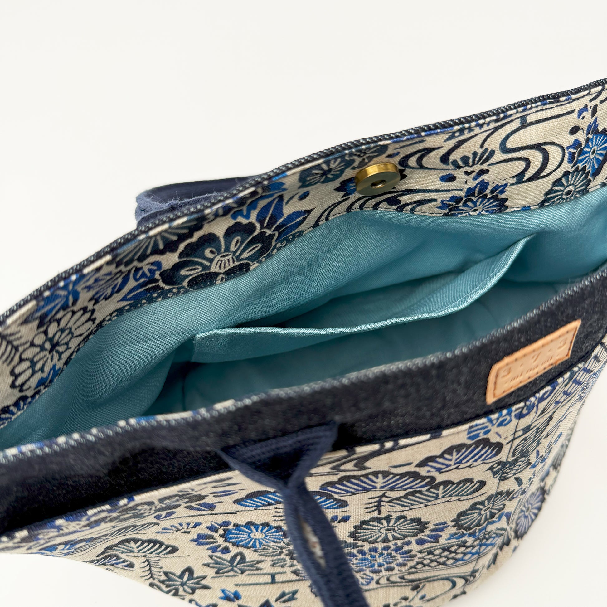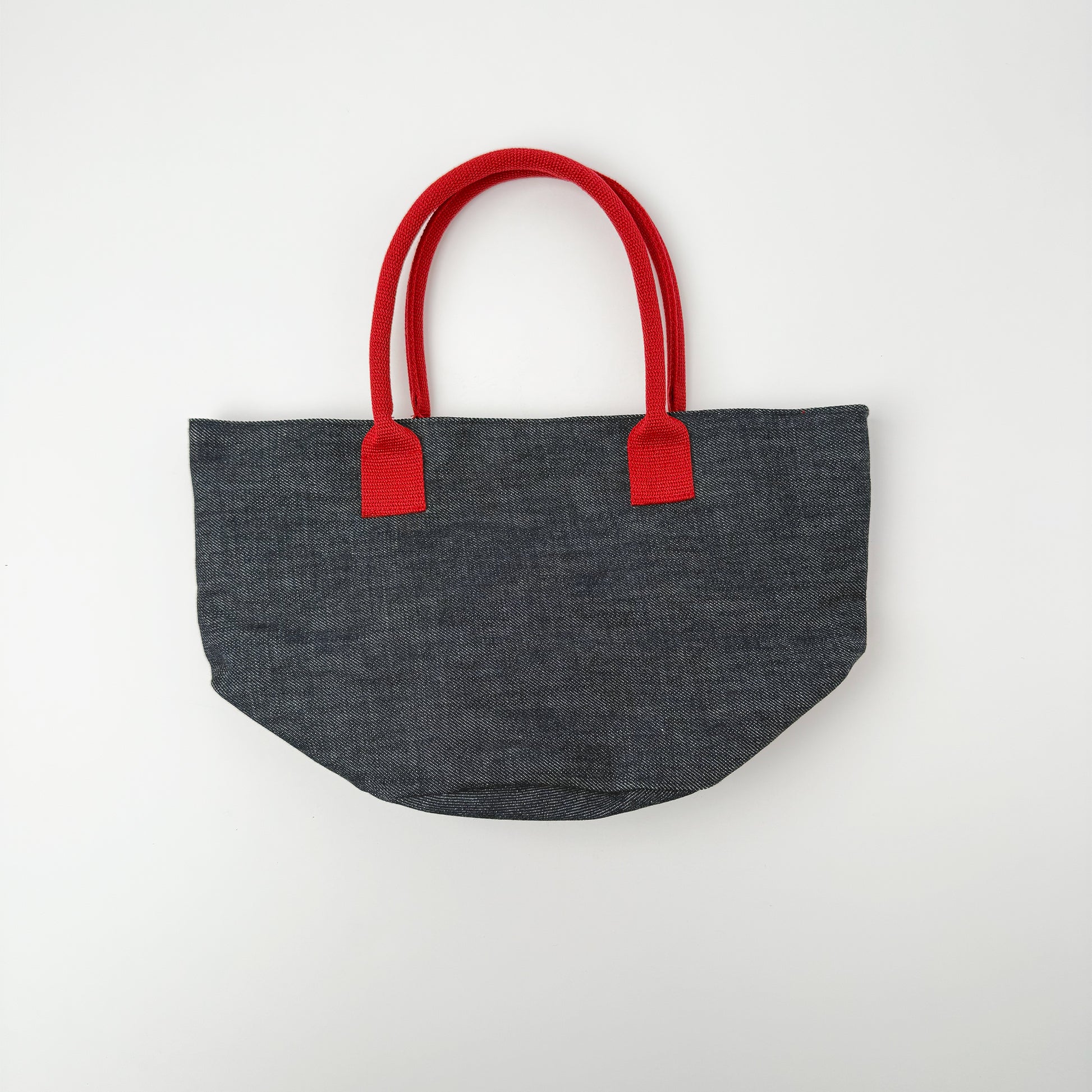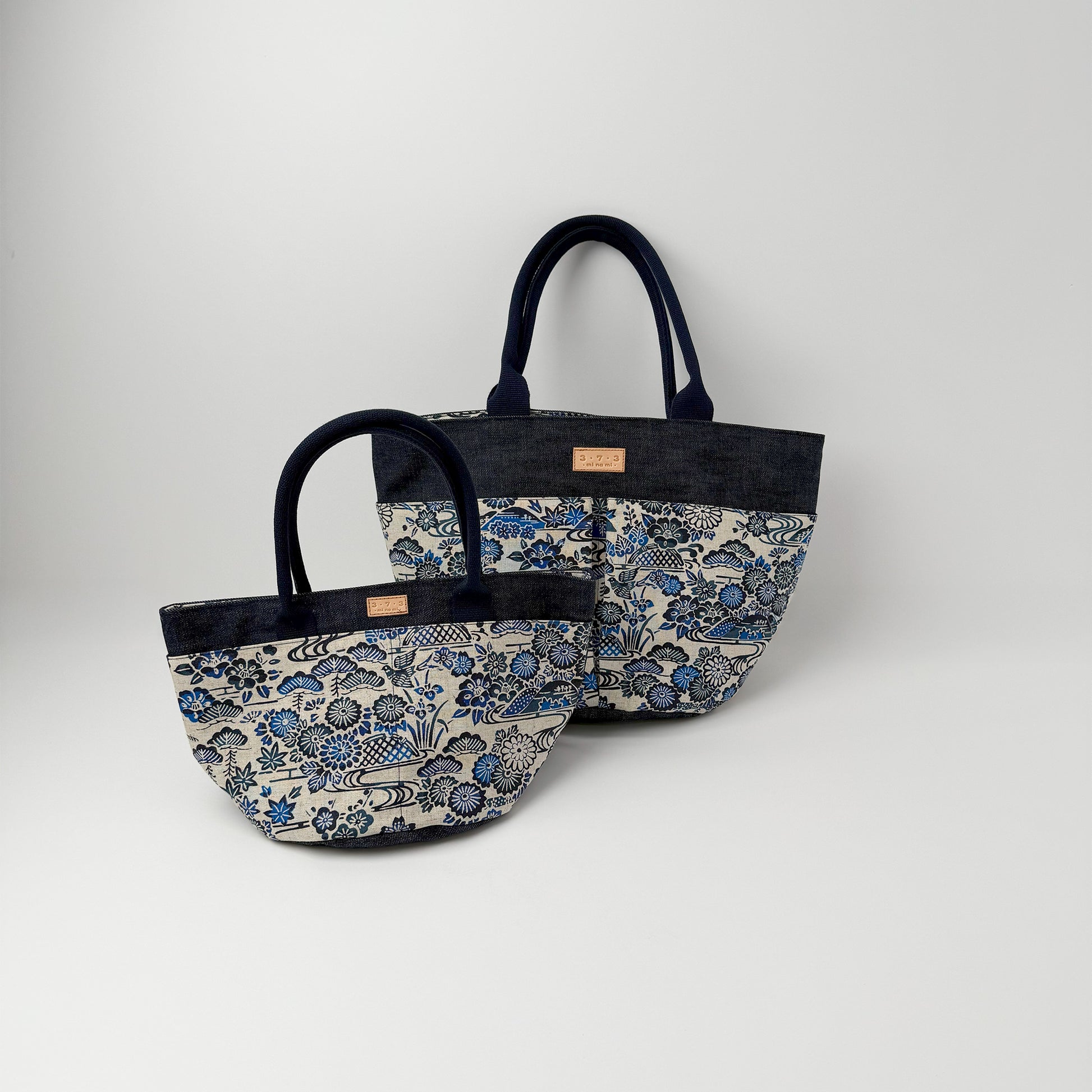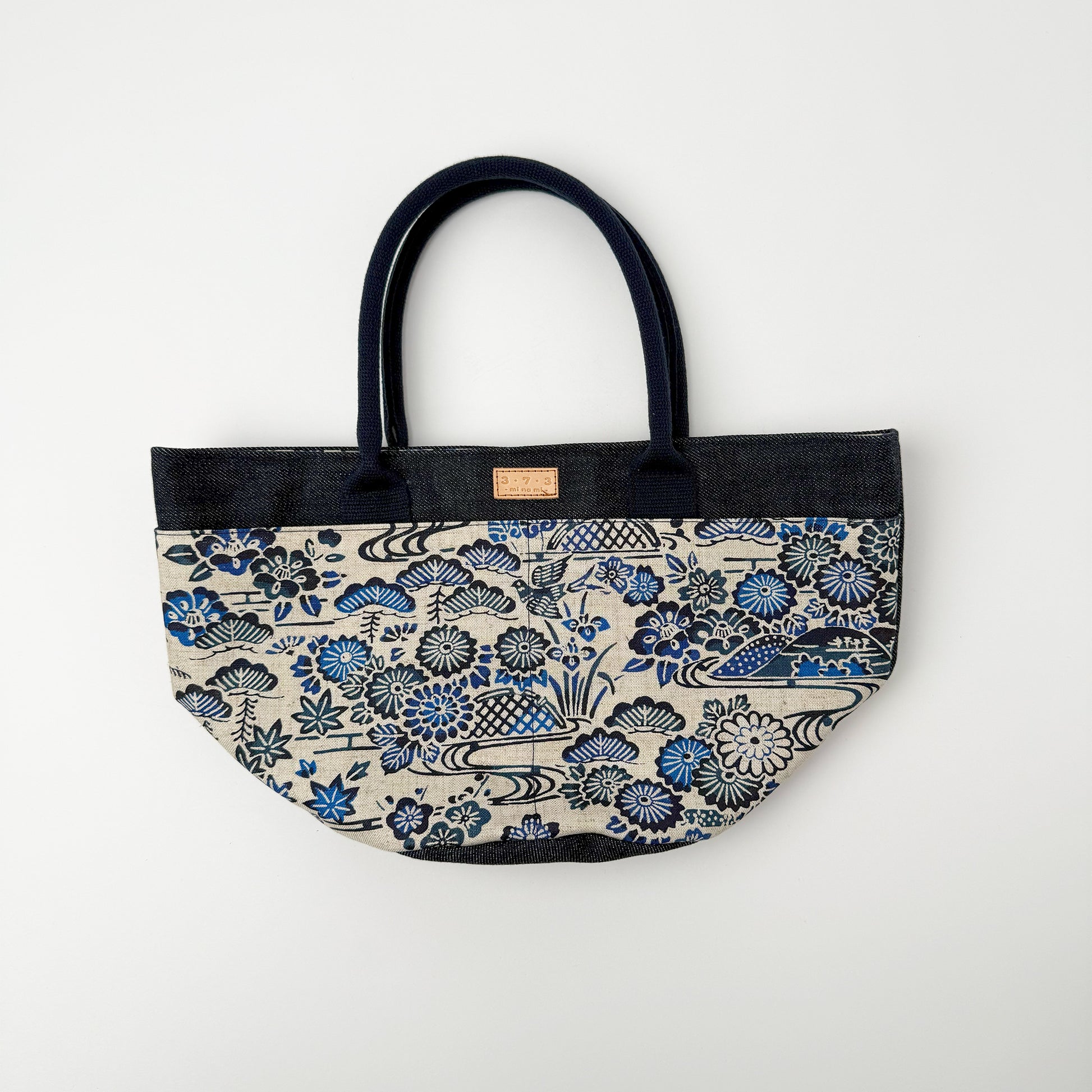 手捺染の技法を生かして表現した紅型柄と高品質な岡山デニムを掛け合わせました。紅型柄とデニムをバランスよく配置し、日常使いしやすいデザイン。マチもたっぷりとあり、お弁当なども安心して入れられるサイズ感です。紅型柄部分は外ポケットになっていて携帯など入れるのに便利です。内ポケットも1か所あり。