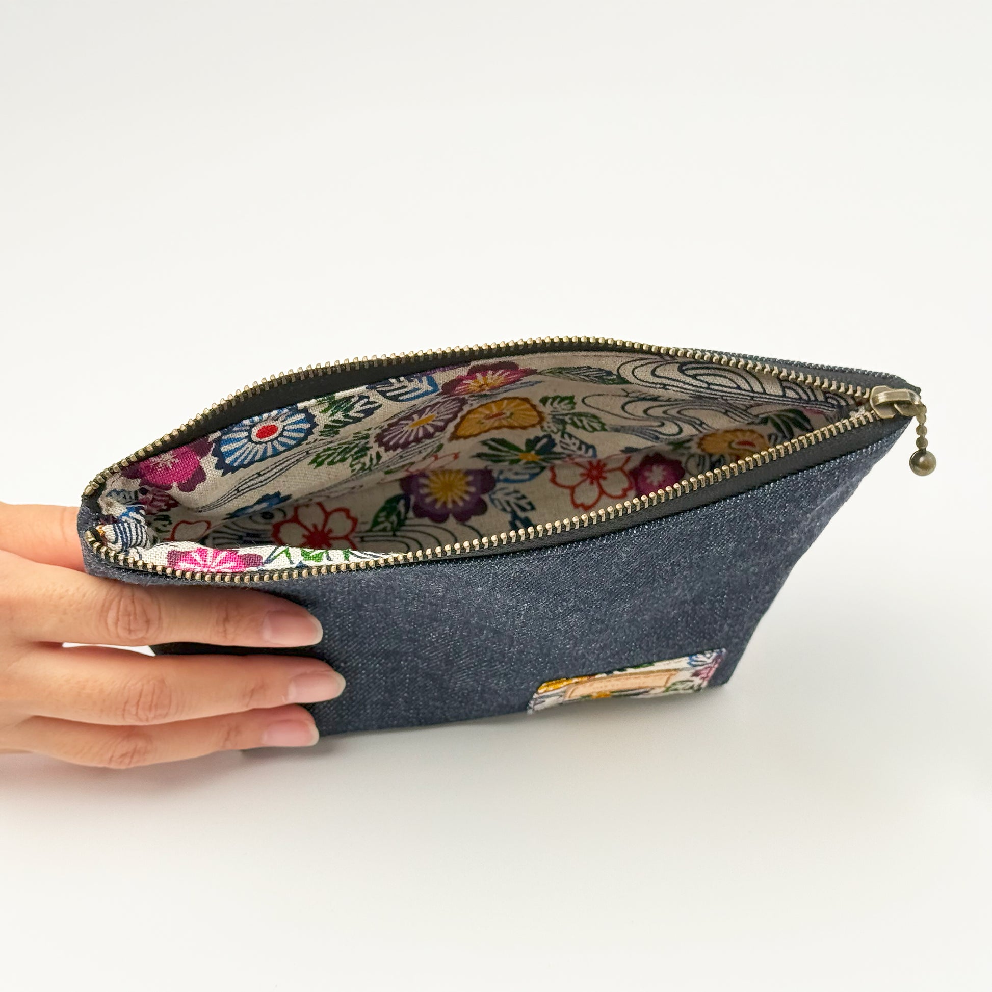 手捺染の技法を生かして表現した紅型柄と高品質な岡山デニムを掛け合わせました。表面はデニム、内側には紅型柄の生地を使用し、使用するごとに沖縄を感じられるデザインに仕上げています。