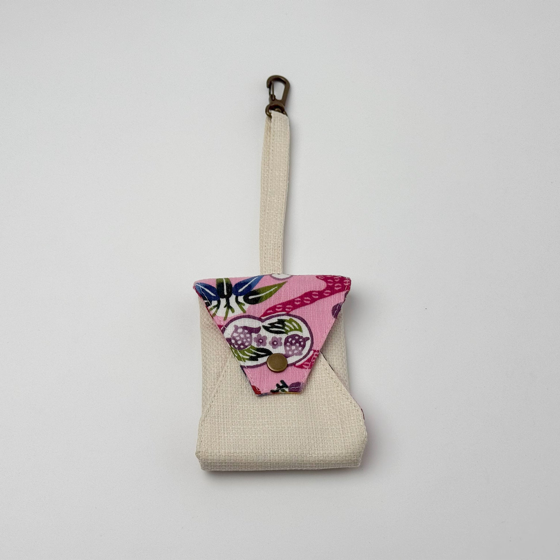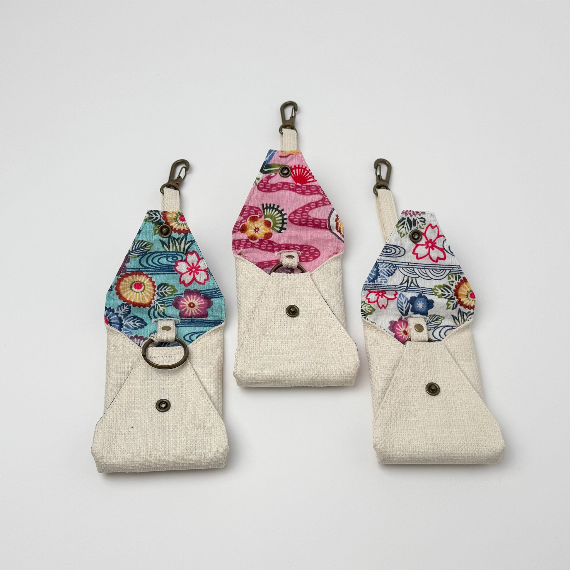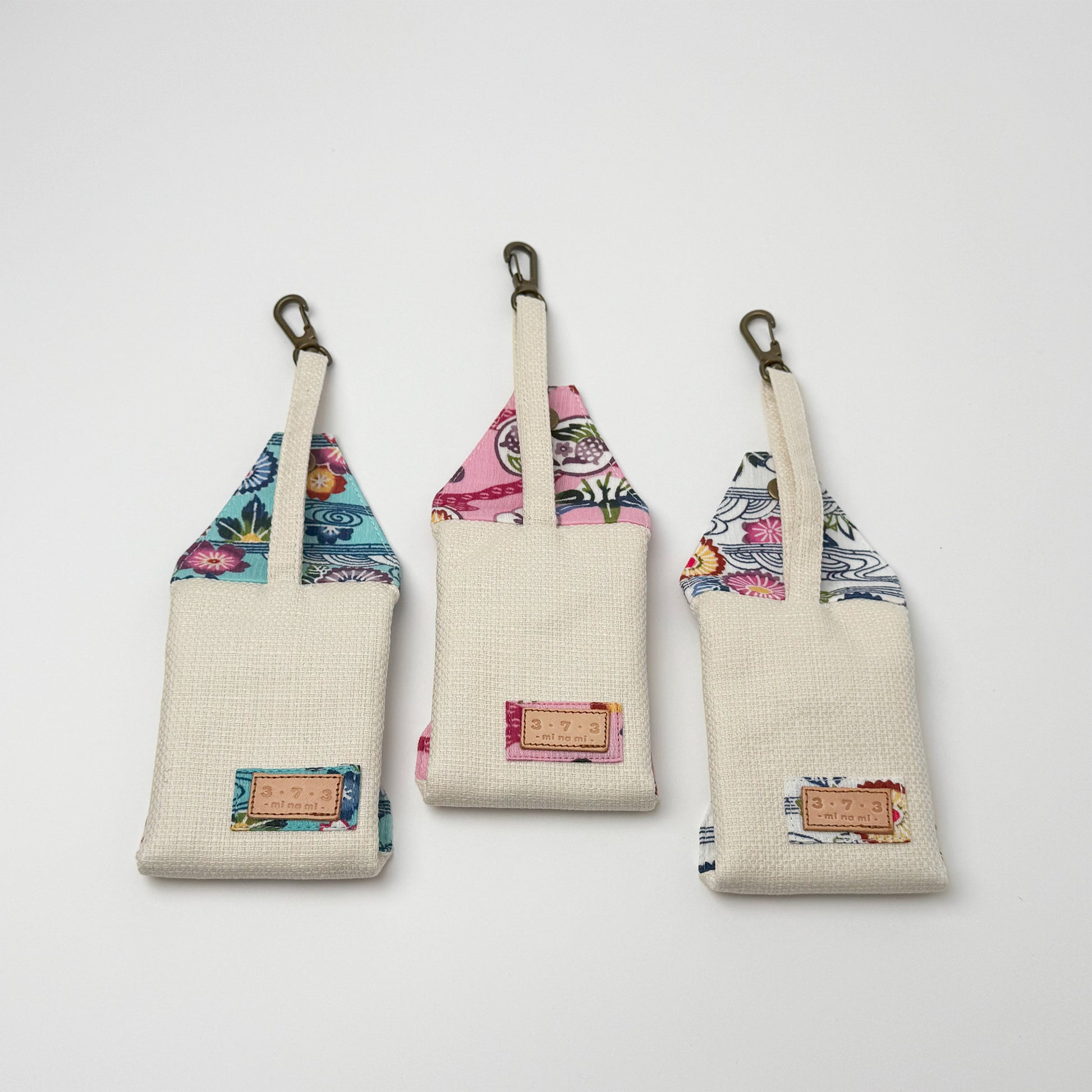 手捺染の技法を生かして表現した紅型柄をポイント使いしたキーケース。バッグの中で迷子になりがちな鍵類をまとめておけるケースです。付属のカラビナをバッグの持ち手などに引っかけておくと取り出しもさっとしやすくなります。