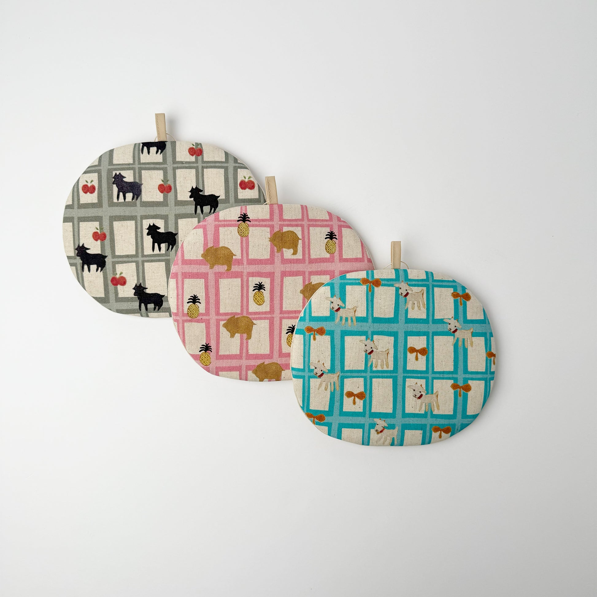 沖縄を中心に活動している陶芸工房”アトリエクッチャネ”と沖縄南風堂がコラボ。アトリエクッチャネの可愛らしいモチーフをグッズにしました。鍋敷きとしてはもちろん、切込みが入っているので、ミトンにもなるアイテムです。ループも付いていて、フックに引っかけることも可能。可愛らしいモチーフが描かれているので、キッチンの風景がほっこりとします。
