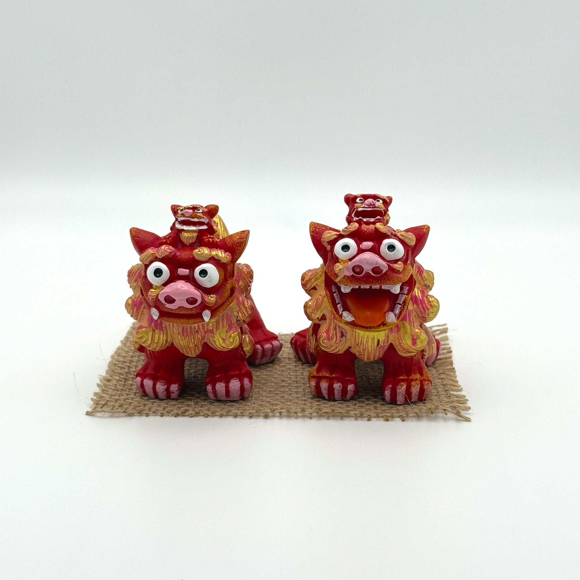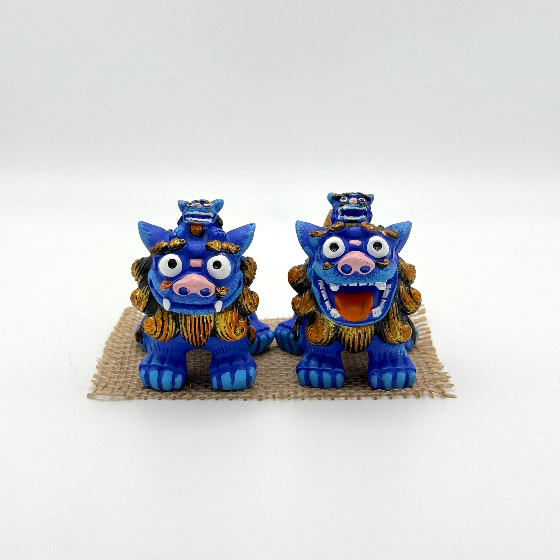親シーサーの上に小さなこどもシーサーが乗った可愛らしい親子シーサーです。