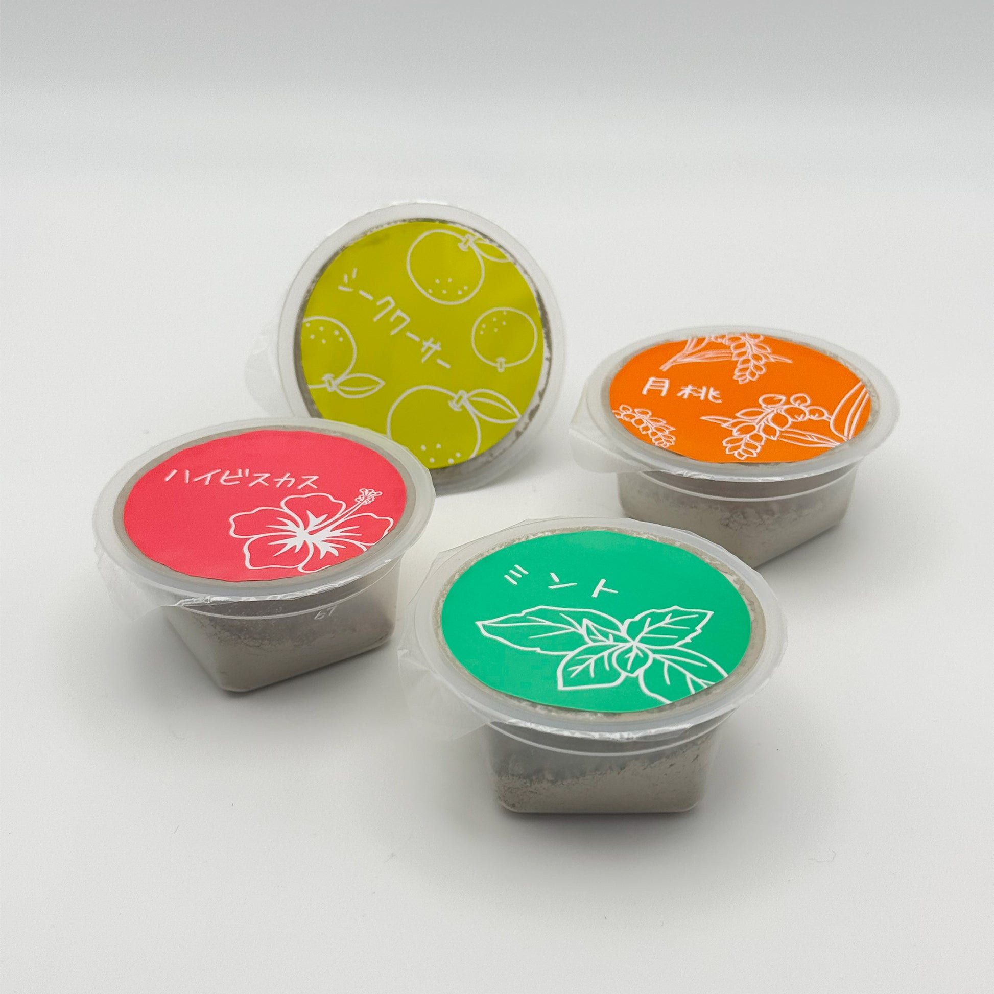 沖縄の天然海泥(クチャ)。沖縄の微細な粘土質の土で、落ちにくい毛穴の汚れや余分な皮脂取りなどのスキンケア素材として重宝されています。使い切りサイズで4つの香りが楽しめる4パックセット。