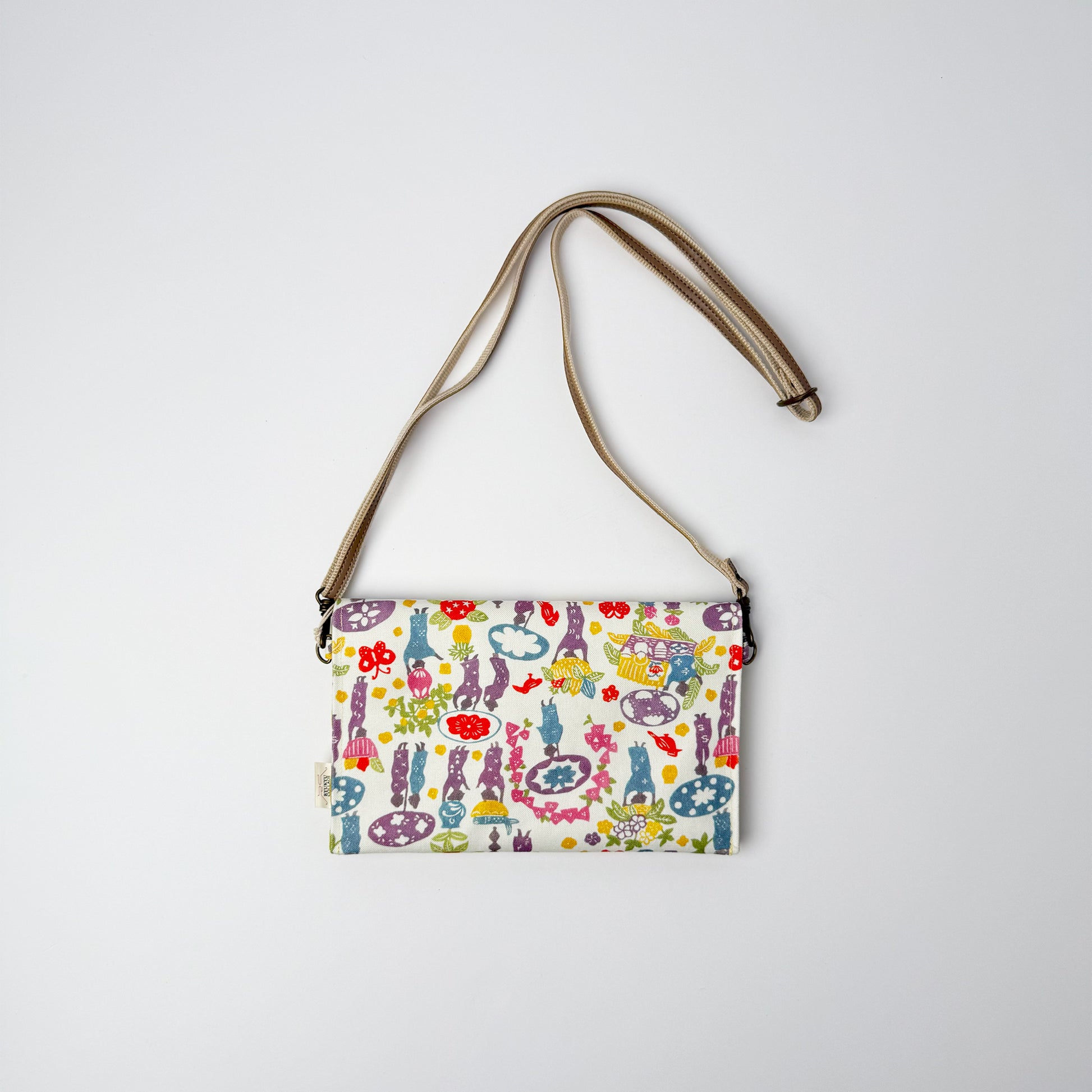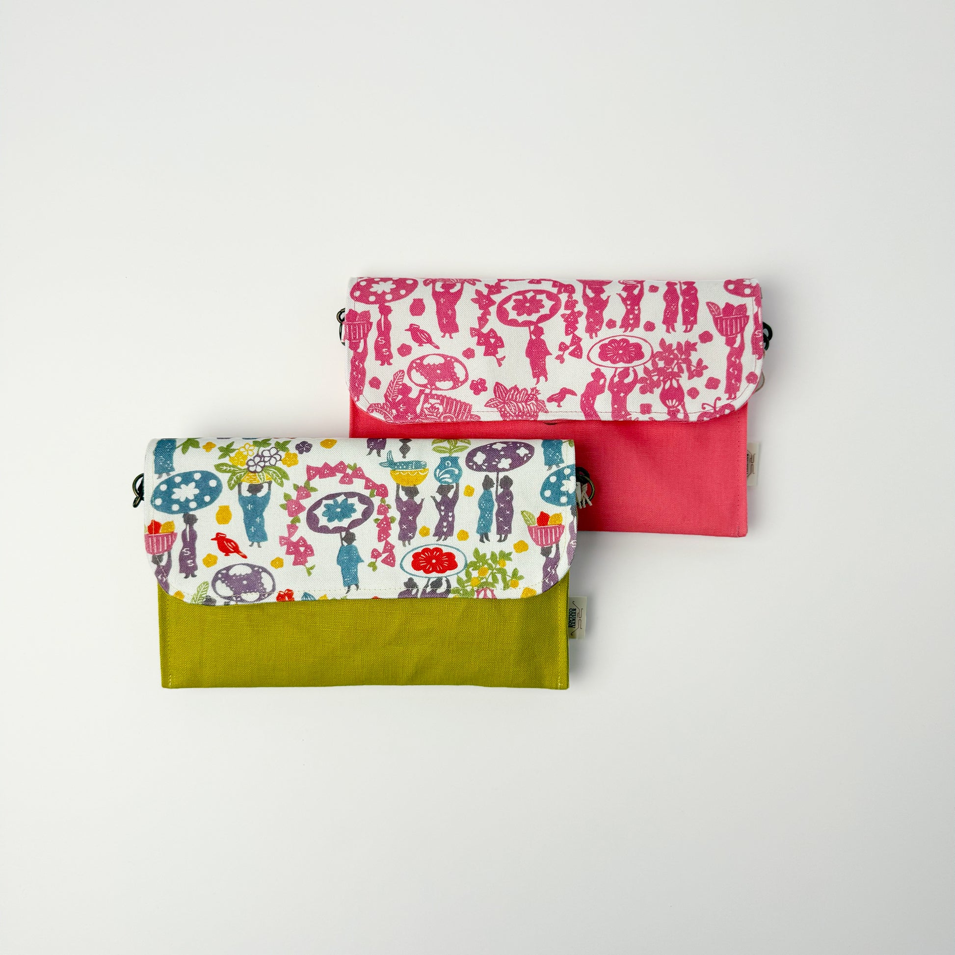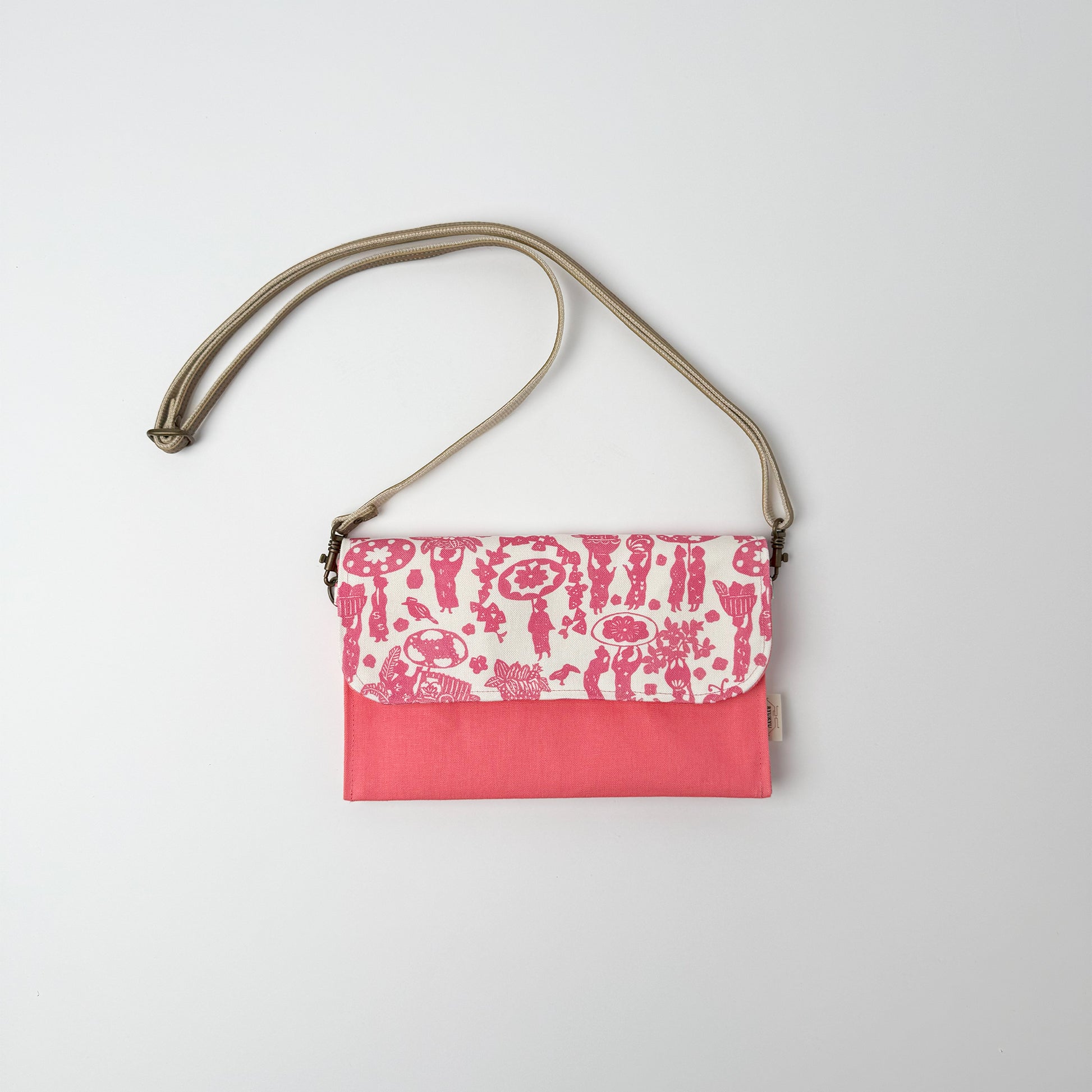 古き良き琉球の暮らしの風景を表現した生地を使用した2wayポーチ。かつての琉球(沖縄)のにぎやかな市場の風景を鮮やかにデザインしています。内側に仕切りがあり、細かいものを仕分けて収納することができます。紐部分が取り外し可能で、肩掛けポーチとして使用したり、紐を取り外してバッグインポーチとしてもお使い頂けます。