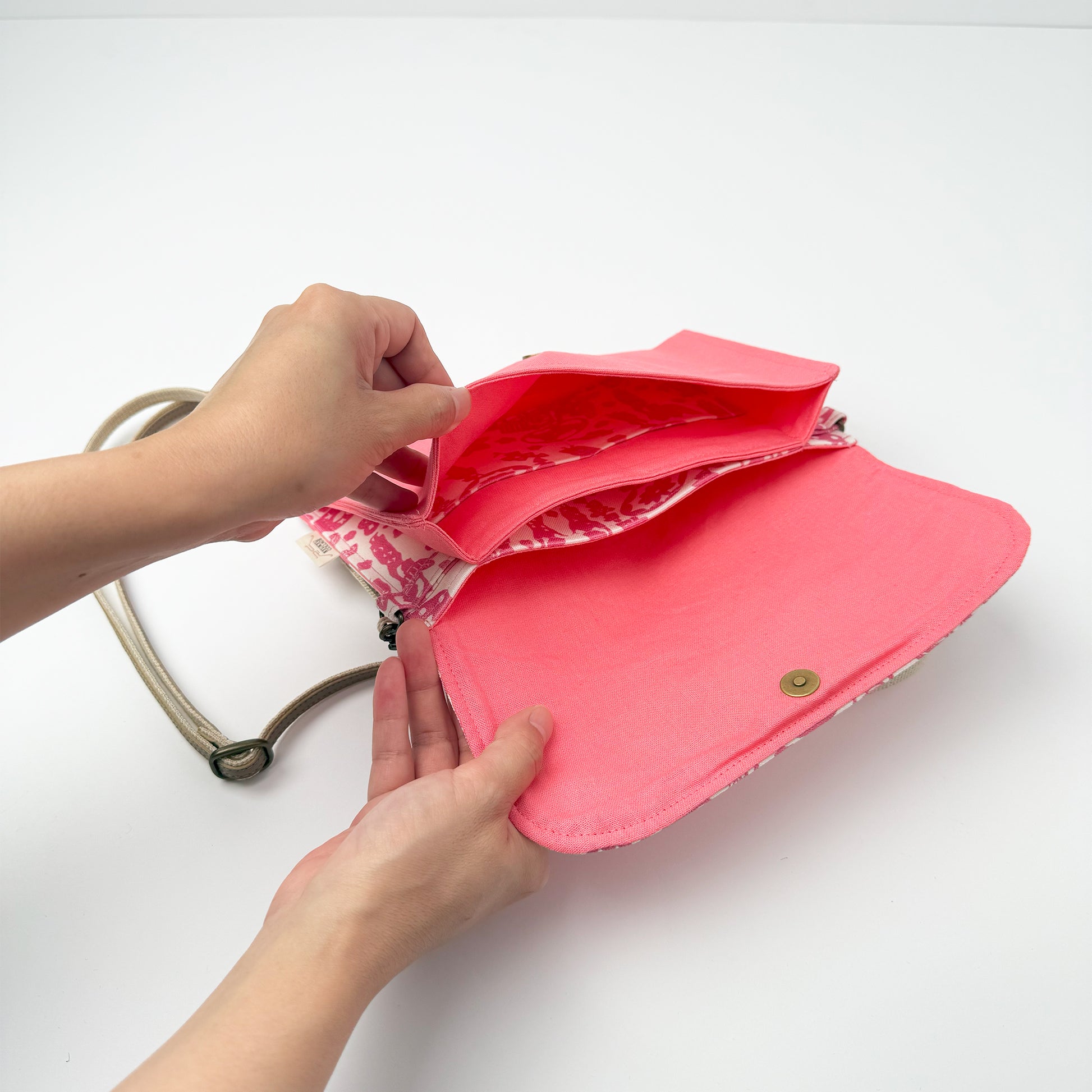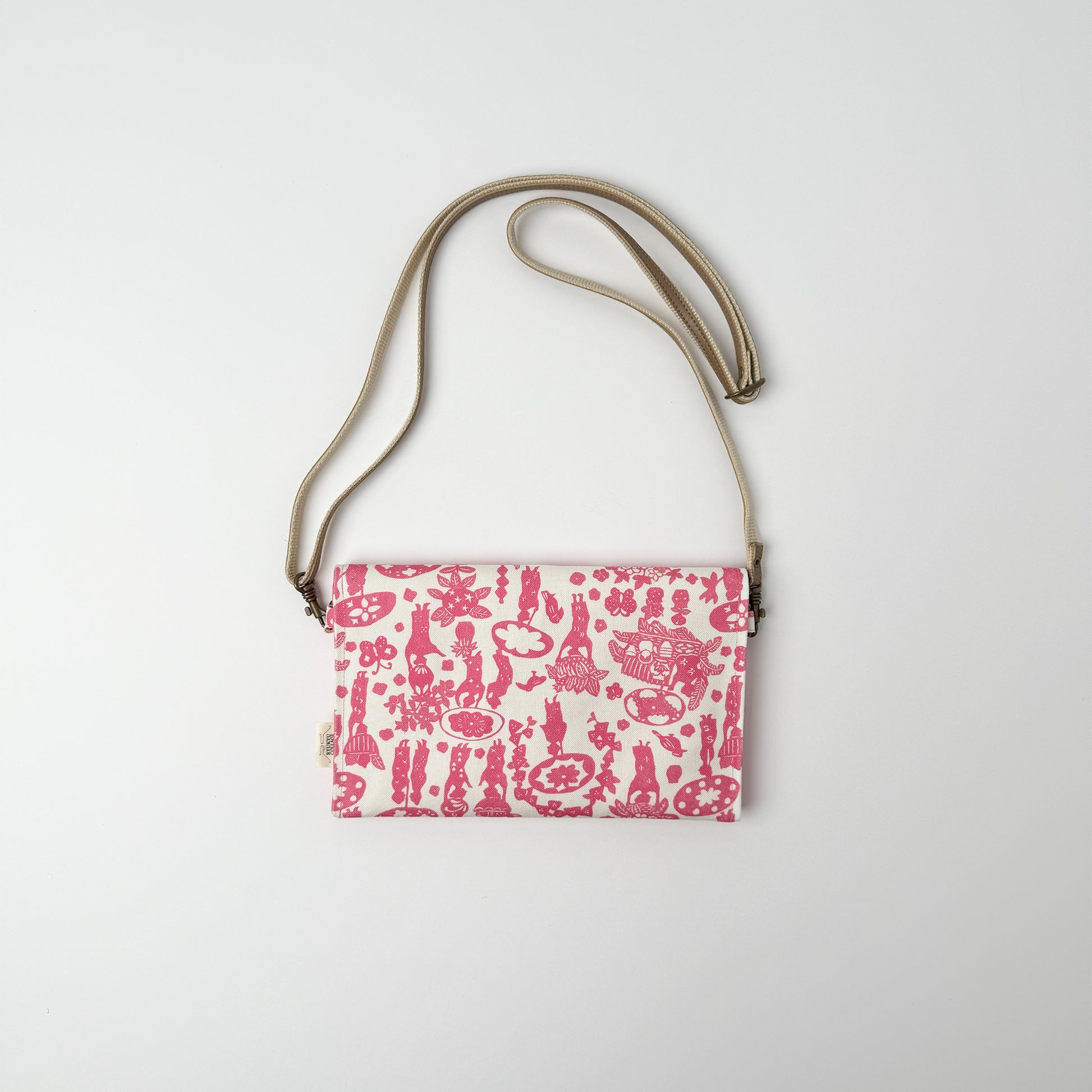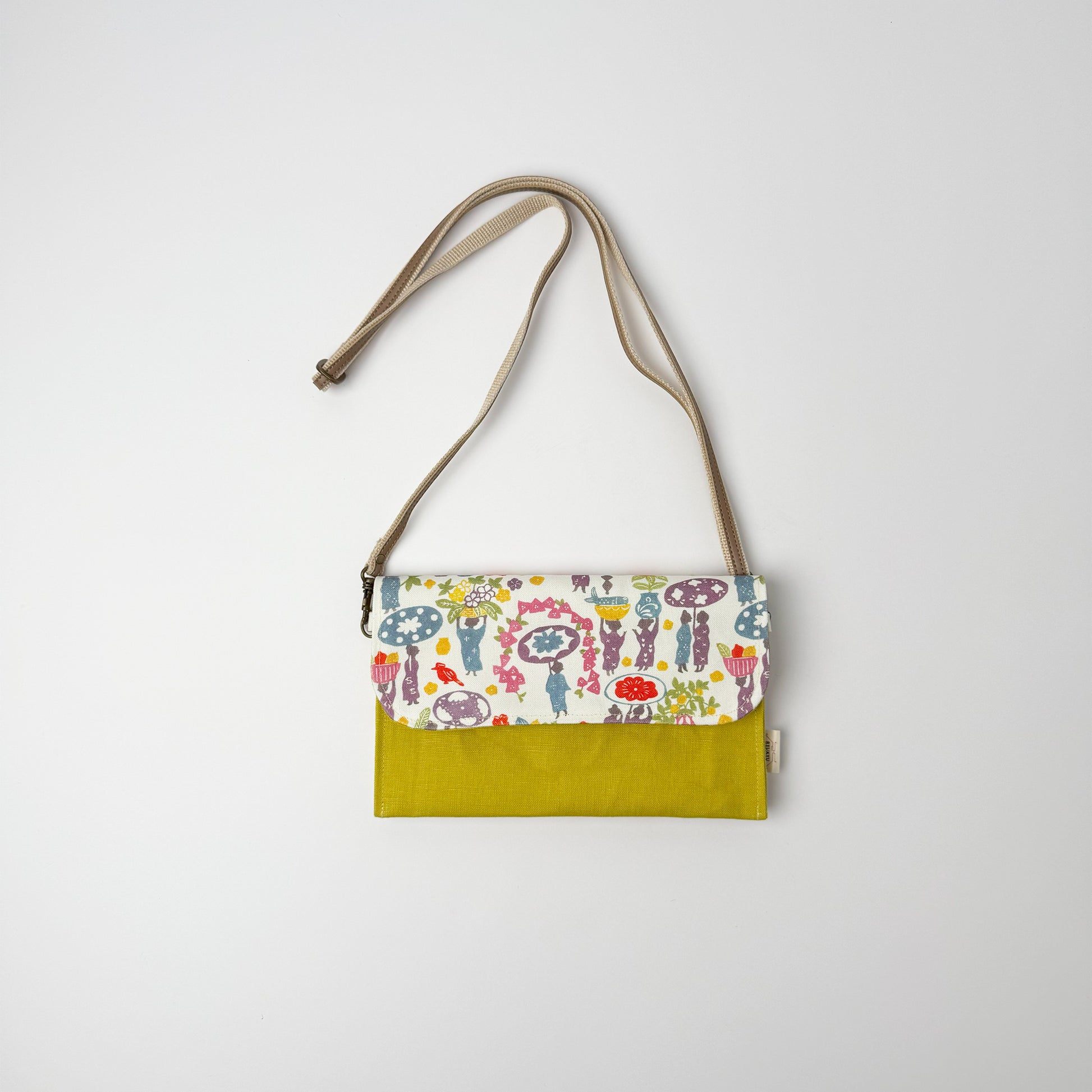 古き良き琉球の暮らしの風景を表現した生地を使用した2wayポーチ。かつての琉球(沖縄)のにぎやかな市場の風景を鮮やかにデザインしています。内側に仕切りがあり、細かいものを仕分けて収納することができます。紐部分が取り外し可能で、肩掛けポーチとして使用したり、紐を取り外してバッグインポーチとしてもお使い頂けます。