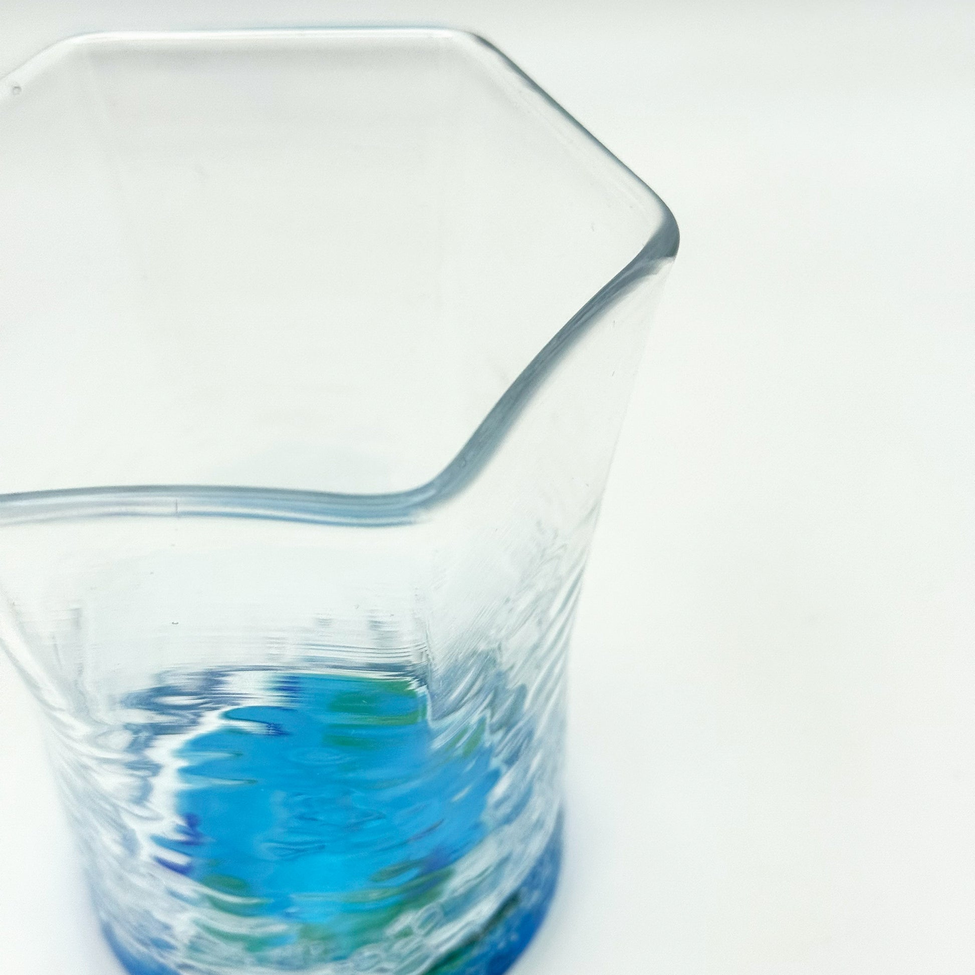 角度によって表情を変える、六角形の美しいグラス。角から口へと自然に液体が流れ込む設計で、驚くほどスムーズな飲み心地を実現しています。工房オリジナルデザイン「オキナワオーシャン」:沖縄の海をそのまま閉じ込めたような奥行きのある美しいグラデーションと無数の泡が特徴。