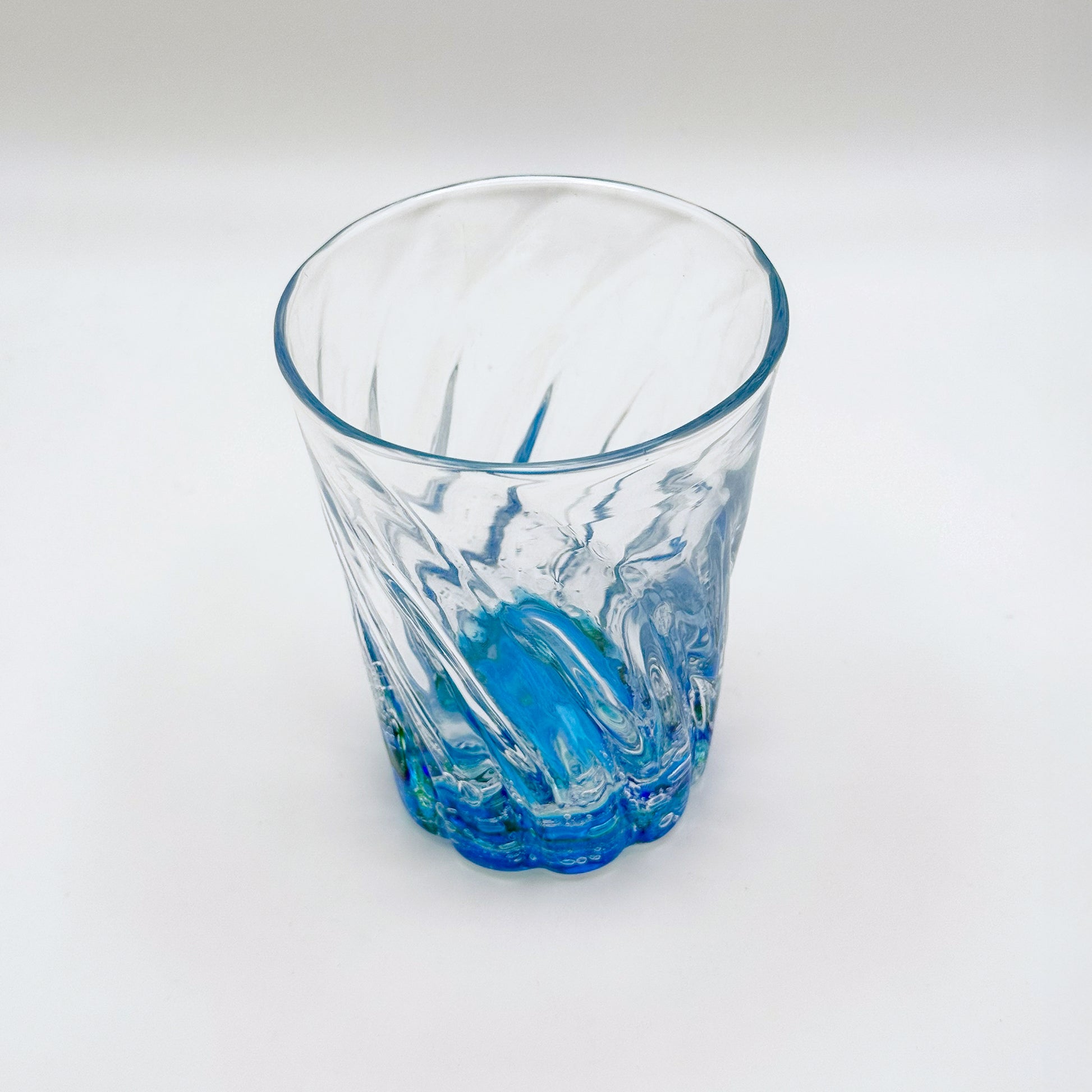クリアのグラスの底に複雑に合わさる青と泡(オキナワオーシャン)を入れることで、工房から見渡せるどこまでも広がる海を閉じ込めたような仕上がりに。工房オリジナルデザイン「オキナワオーシャン」:沖縄の海をそのまま閉じ込めたような奥行きのある美しいグラデーションと無数の泡が特徴。