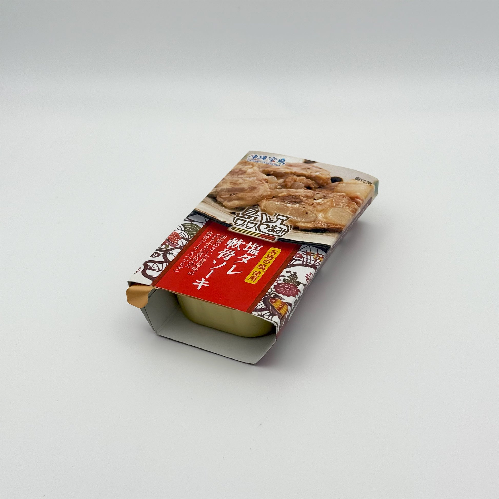 “フタを開けるだけで、ご家庭で手軽に楽しめる沖縄料理”をテーマにしたシリーズ。胡椒の効いた旨塩味。プルプルになるまで煮込んだ軟骨ソーキ(スペアリブ)。石垣島の塩を使用しています。