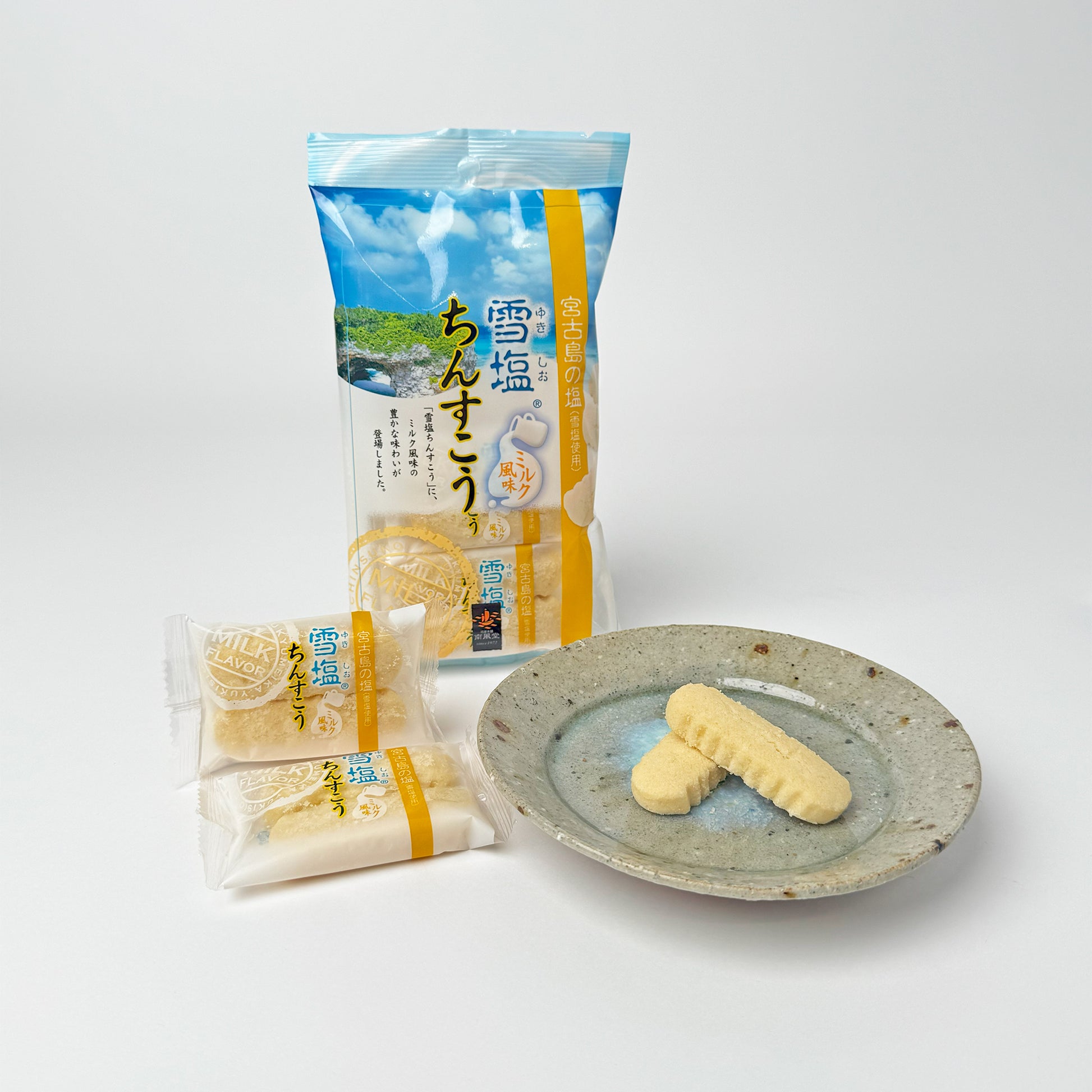 宮古島の地下海水を汲み上げて精製された「雪塩」と琉球の伝統菓子「ちんすこう」を独自の製法で組み合わせ、雪塩の塩味にミルクの優しい甘さを加えました。